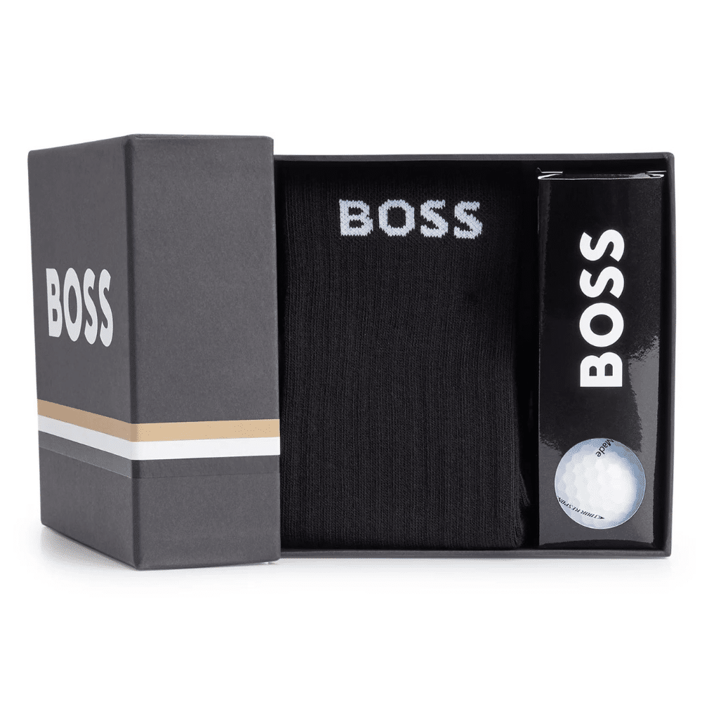 Black Ribbed mid-calf socks by BOSS in a cotton blend with signature logo and stripes. They come with three branded golf balls in a presentation box.