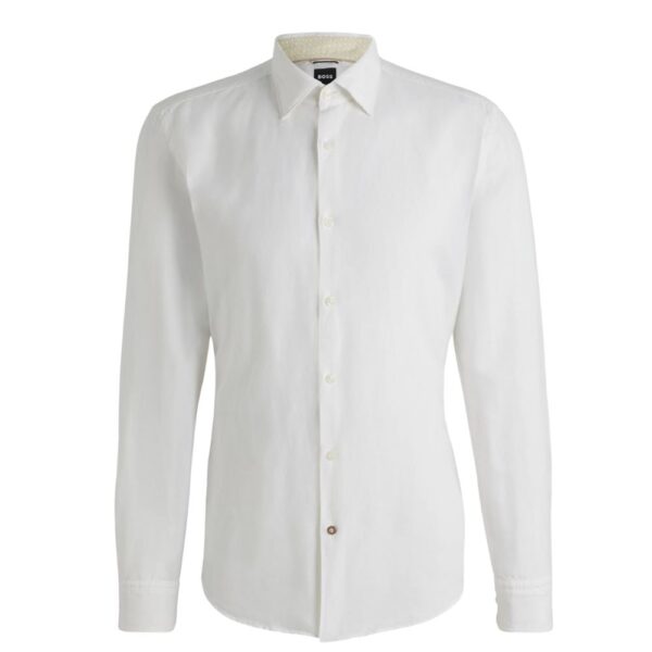 In a flattering straight fit with a spread collar, this BOSS Menswear white shirt is a business essential for summer. Cooling linen blend for comfort.
