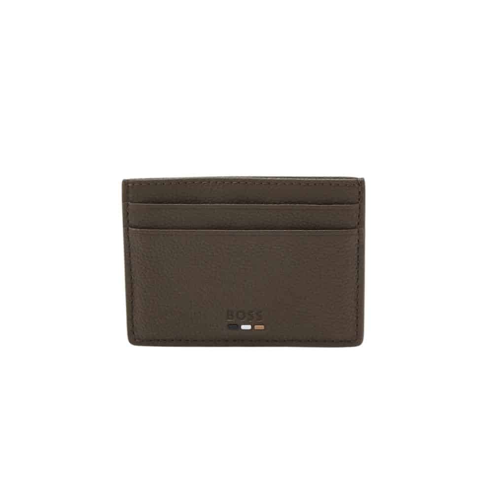 This BOSS Dark brown Card Holder in grained faux leather by BOSS. Featuring four credit card slots, one inside pocket and finished with an embossed logo with signature stripe on the front. Comes packaged in a presentation box.