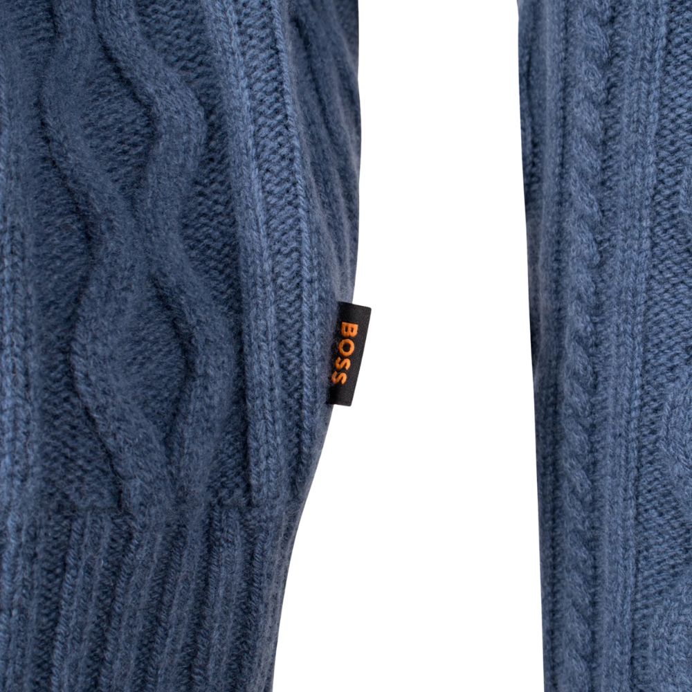 The BOSS Cable Knit Wool Blue Crew Neck Jumper is crafted from soft, premium wool, featuring a classic cable knit texture for added depth and sophistication. Its crew neck design allows for versatile styling and easy layering over shirts or t-shirts, providing both warmth and comfort. The rich blue colour adds a timeless touch to your smart-casual wardrobe, making it an ideal choice for polished, effortless style in cooler weather.
