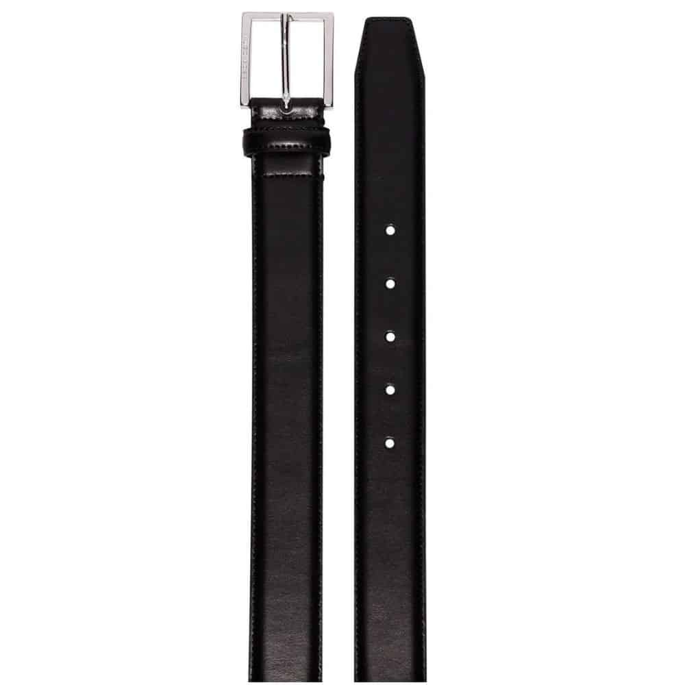 The Canzio leather belt by BOSS menswear in Black is a classic five hole black leather belt with high shine gunmetal buckle, engraved with Hugo Boss logo on the base with a single leather wrapped keeper.