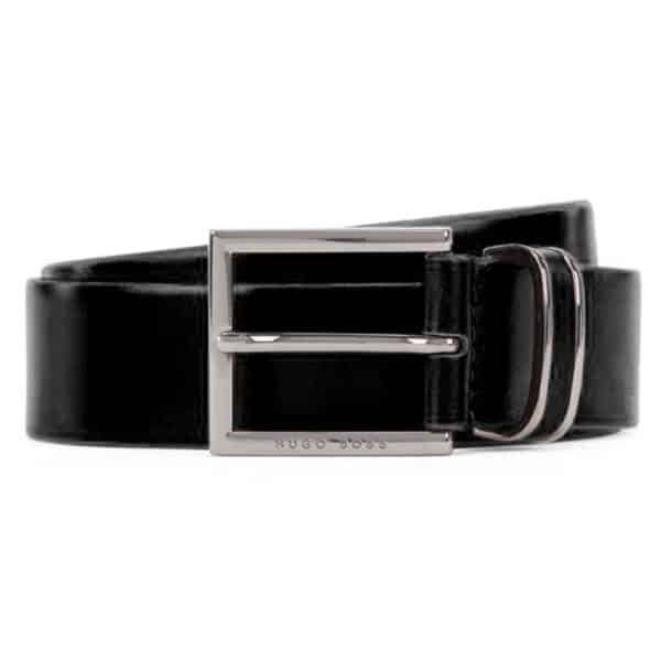 The Canzion black leather belt by BOSS menswear offers a classic style. 3.5cm five hole belt with engraved Hugo Boss logo on the base of the high shine metal buckle. A metal fastener completes this smart accessory.