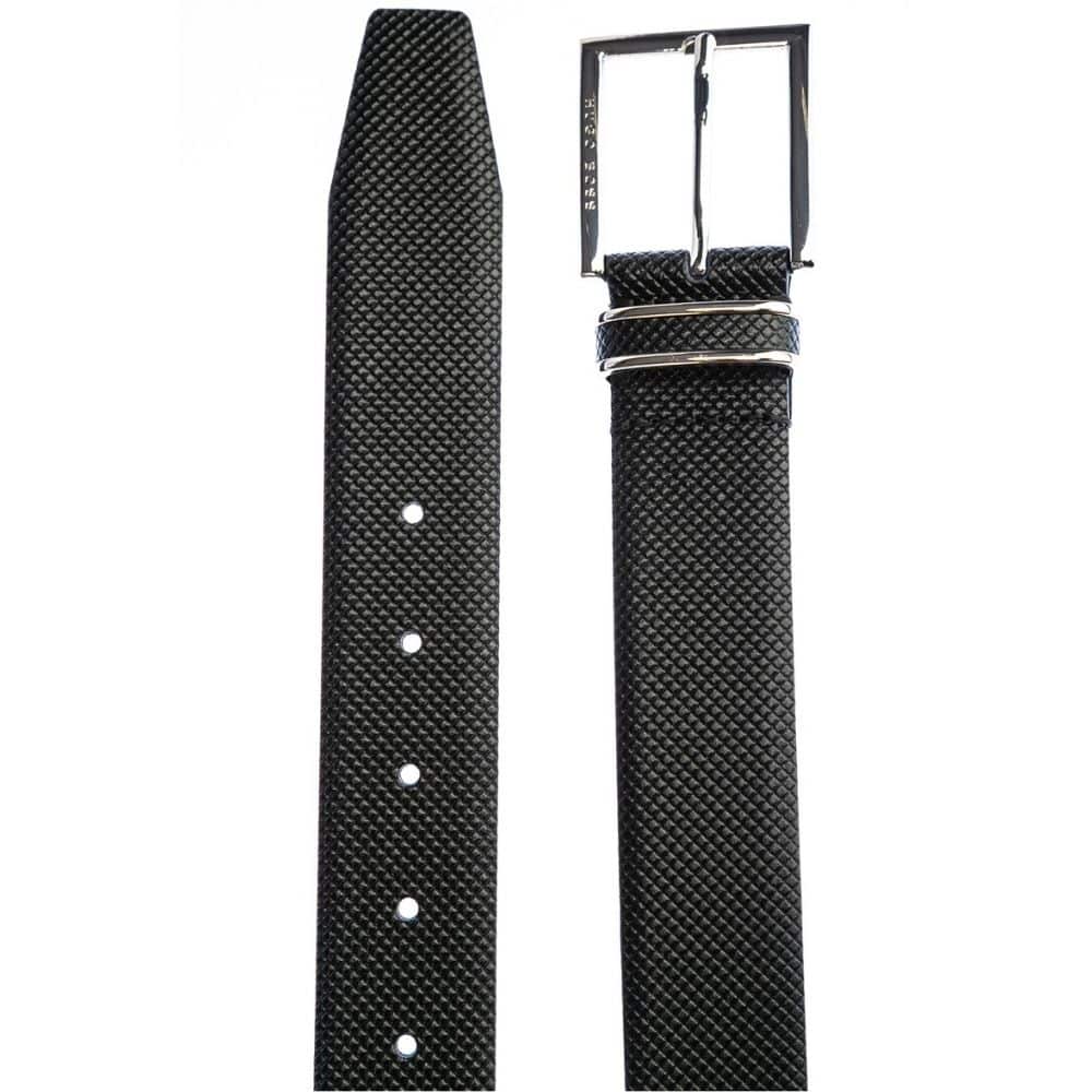 The Canzion black leather belt by BOSS menswear has a stunning larissa textured leather. A five hole black leather belt with high shine metal buckle, engraved with Hugo Boss logo on the base with a leather wrapped metal fastener.