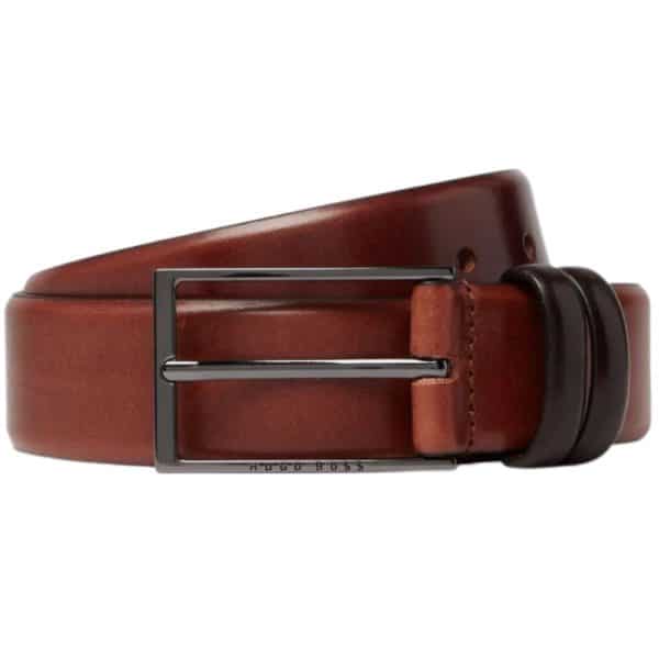 The Carmello leather belt in Tan by BOSS menswear offers a subtle two tone tan colouring. 3.5cm slim five hole belt with engraved Hugo Boss logo on the base of the gunmetal buckle. A sturdy double leather belt keeper and a vegetable-tanning process to enhance the colour completes this character belt.