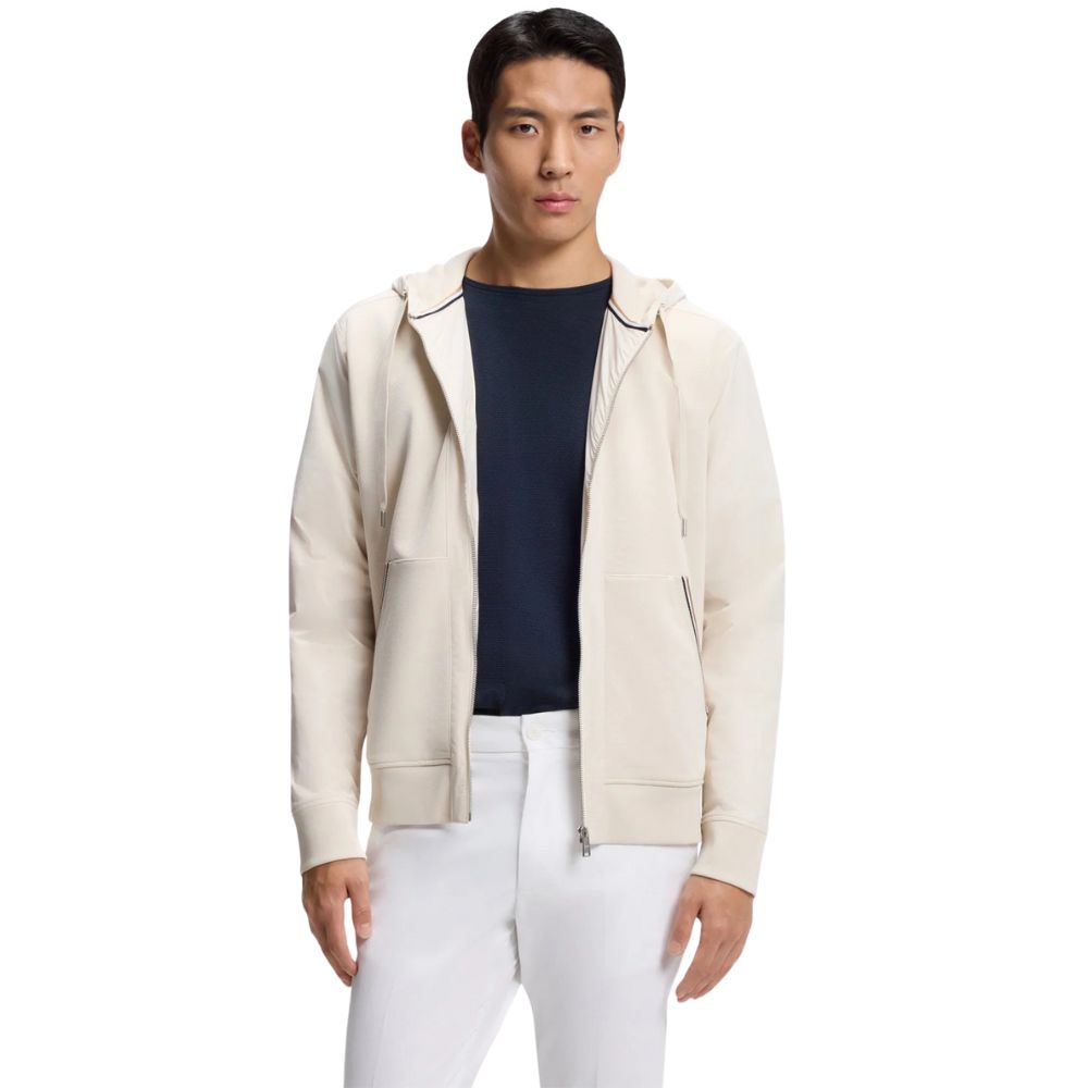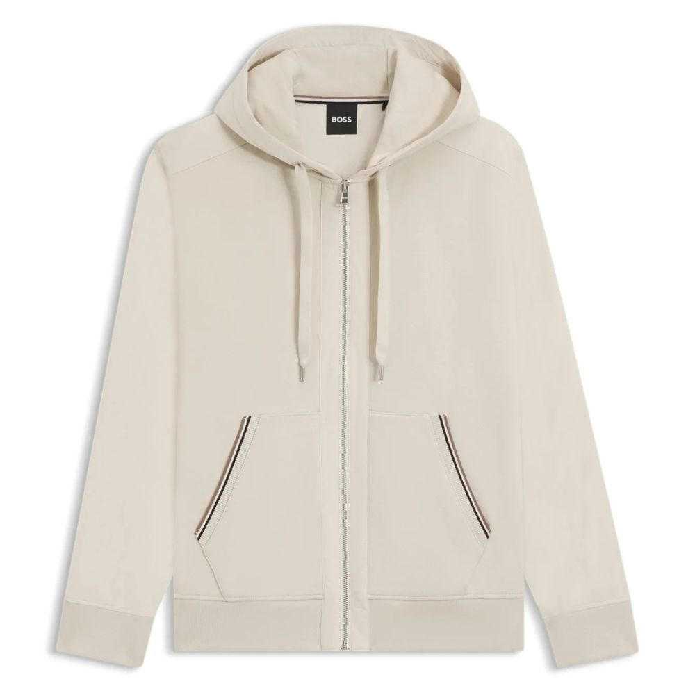 Boss Cotton Terry Zip Up Cream Hoodie With Signature Stripe Trims