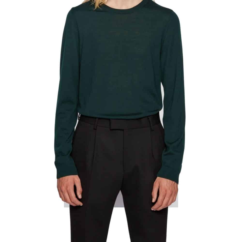 Ethically sourced virgin wool green crew neck sweater by BOSS menswear. A slim fit, contemporary sweater featuring subtle structuring at the side seams. Versatile with jeans, shirts and your favourite jackets.