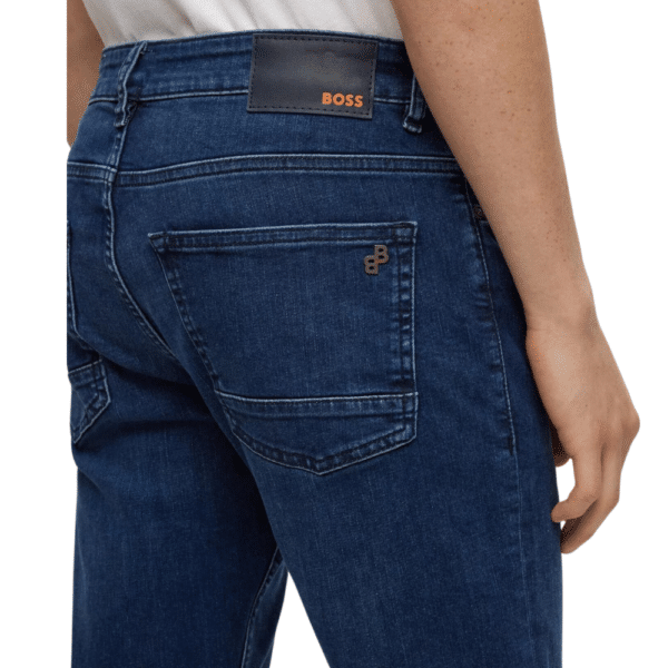 Signature-trim jeans crafted in Dark Blue super stretch denim for wearing comfort and lasting shape retention by BOSS Menswear.