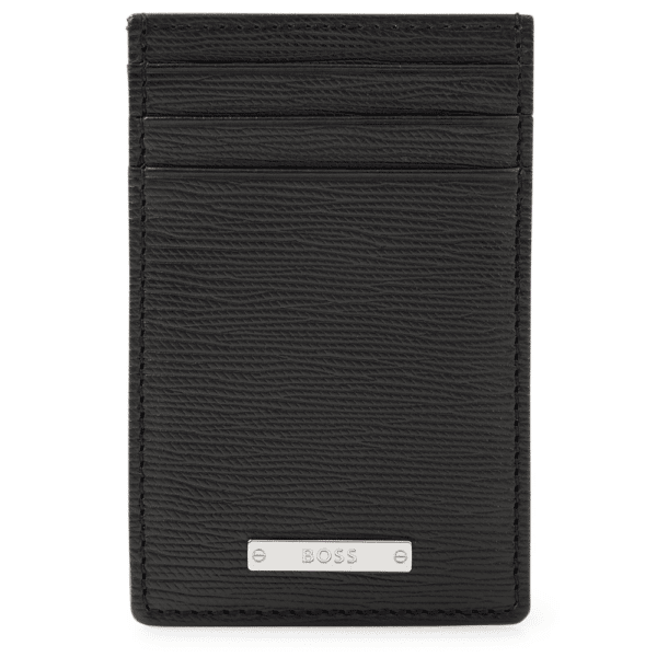 A contemporary card holder by BOSS. Featuring a polished metal plate with an engraved BOSS logo, this elegant card holder is embossed all over with a modern structure.
