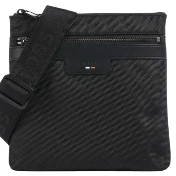 A branded-strap cross body bag by BOSS, detailed with the Boss logo plate and logo writing along the strap.