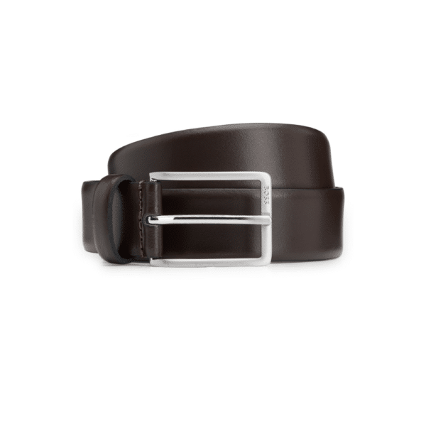 A versatile yet refined 3.5cm Dark Brown belt by BOSS made in Italy from smooth leather with a polished silver-tone pin buckle. This style blends innovative performance technology with a tailored fit. Its elastic band near the engraved logo buckle ensures comfort without sacrificing support, ideal for work or leisure.