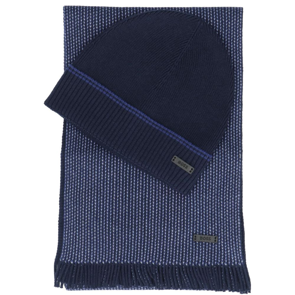 BOSS Hernesto Beanie & Scarf Gift Set for men in dark blue. This accessory gift set from BOSS Menswear is a great gift to give or receive and comes in a gift box. It includes a ribbed knit hat and a matching raschel knit scarf. This product contains at least 60% more sustainable raw materials and is partly made from organic cotton.