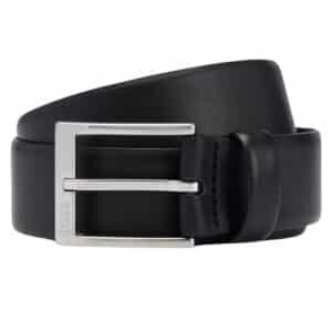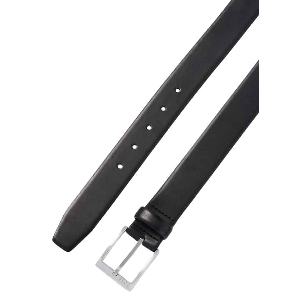An elevated black belt by BOSS. Securing with a silver-tone squared buckle with a polished finish, this belt is crafted in rich Italian leather. The buckle is engraved with a BOSS logo. For the best fit, we advise ordering a belt one size larger than your waist size.