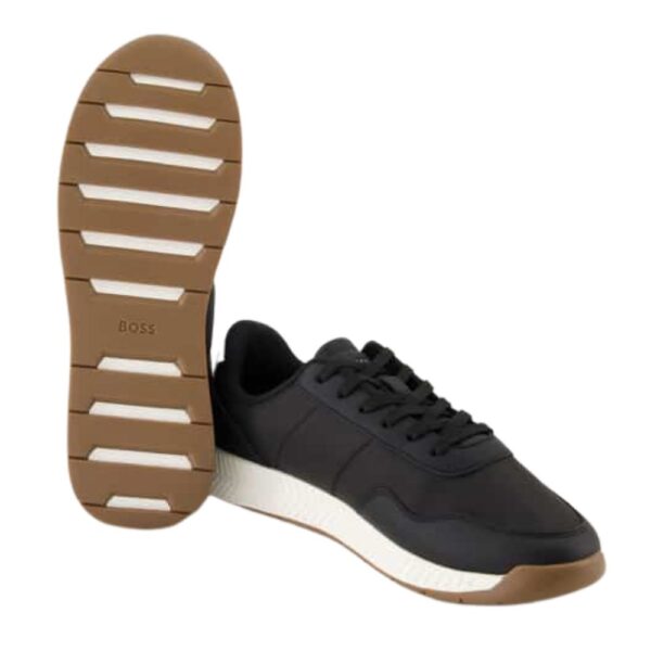 Hybrid black trainers with synthetic coated fabric accents by BOSS. Featuring branding throughout, this ultra-lightweight pair is set on a ridged EVA-rubber outsole. Synthetic coated fabric, sometimes referred to as faux leather, is a fabric designed to resemble real leather, and/or display a matte, glossy, smooth, or textured, coated appearance.