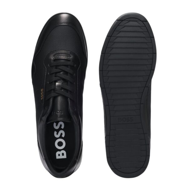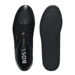 Sporty trainers in grained synthetic coated fabric offset by smooth trims by BOSS Menswear. Dress them up or down for events through the week. Synthetic coated fabric, sometimes referred to as faux leather, is a fabric designed to resemble real leather, and/or display a matte, glossy, smooth, or textured, coated appearance.