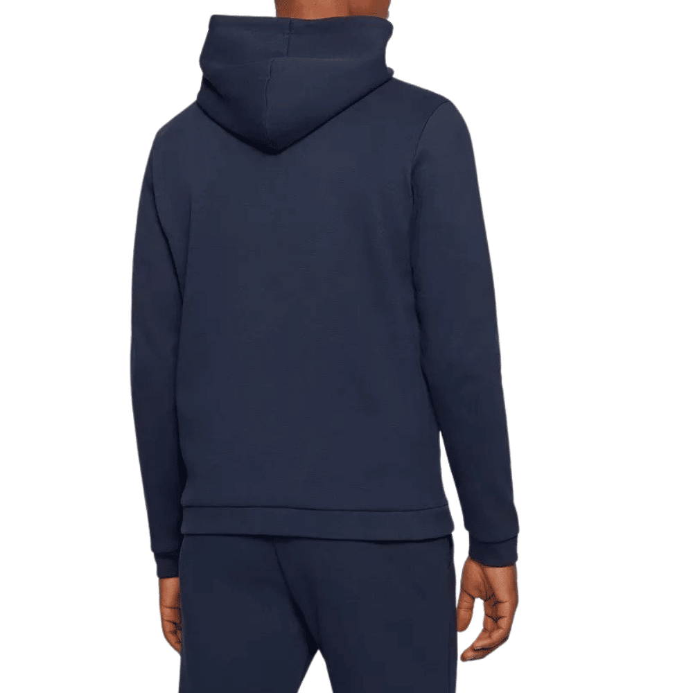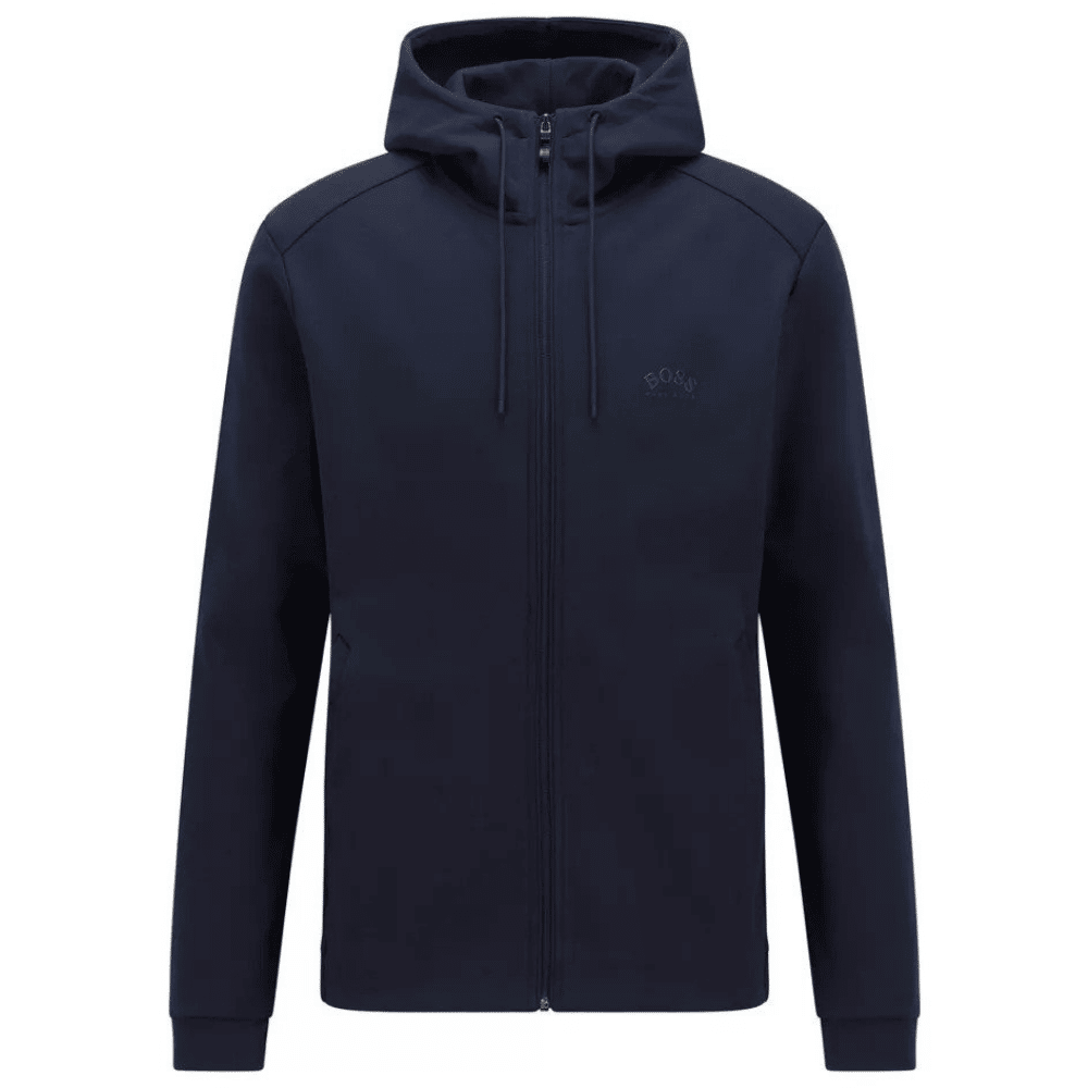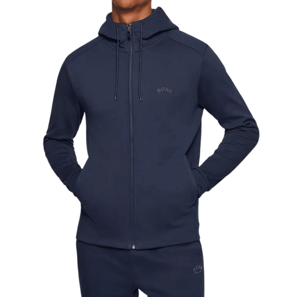 A full zip hoodie sweatshirt in navy by BOSS Menswear, created in double-faced cotton with a cotton-blend back panel in a piqué structure. Styled with a regular fit and a zip through the centre front, this sporty sweatshirt is detailed with a signature zip puller, contrast accents at the back neck and a curved logo at the chest. Side-entry pockets are supplemented by an additional zipped pocket that’s perfect for keeping a smartphone close at hand