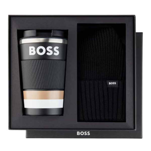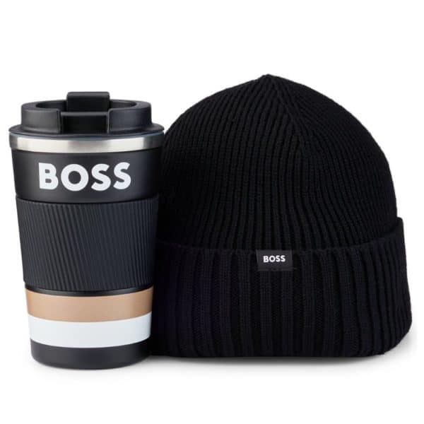 An elegant gift set by BOSS, comprising a travel mug with branding and signature stripes, and a ribbed beanie hat with a logo label.