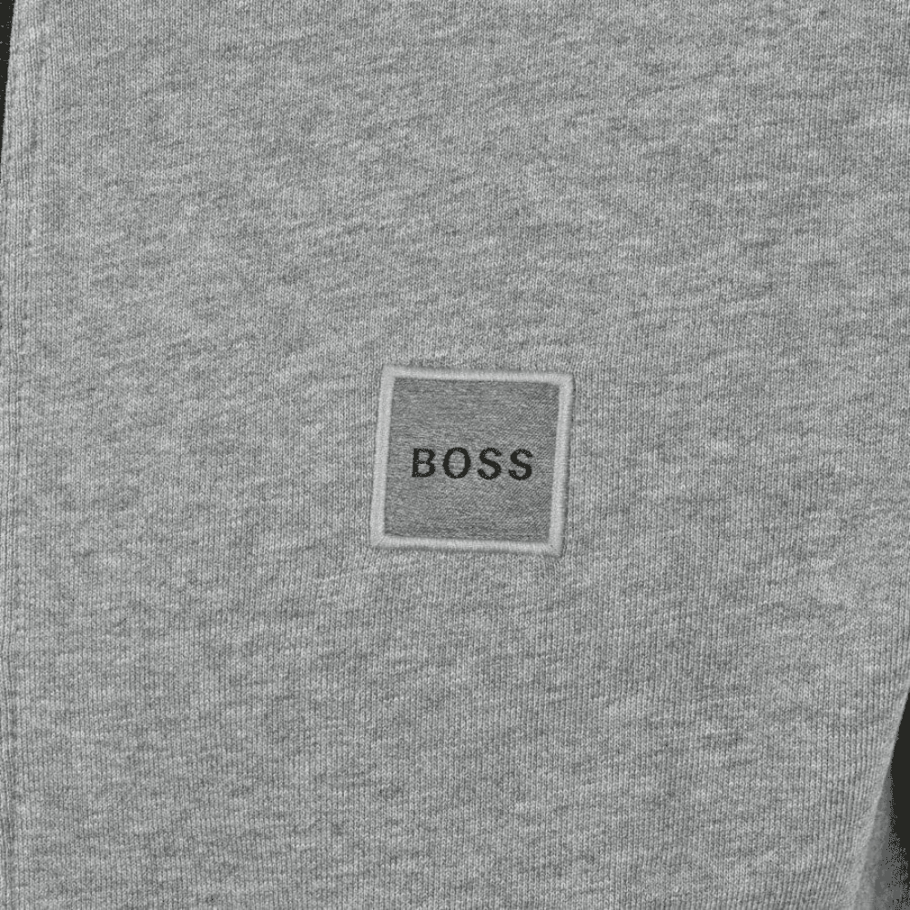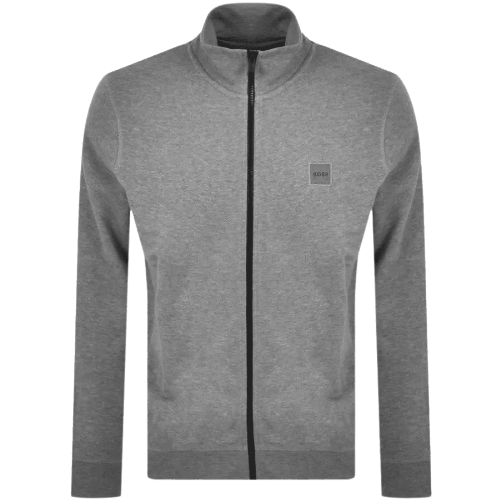BOSS Zestart 1 Full Zip Sweatshirt In Grey. A full front branded zip fastening in black with a ribbed stand up collar. Ribbed cuffs on the long sleeves with a stretch ribbed waistband and two pockets at the hips. The signature BOSS logo patch is embroidered on the left of the chest in black and grey.