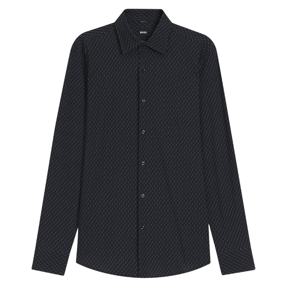 The BOSS Hank Slim Fit Navy Shirt features a modern silhouette with subtle floral trim detailing for a refined touch. Effortlessly sharp and perfect for smart-casual styling.
