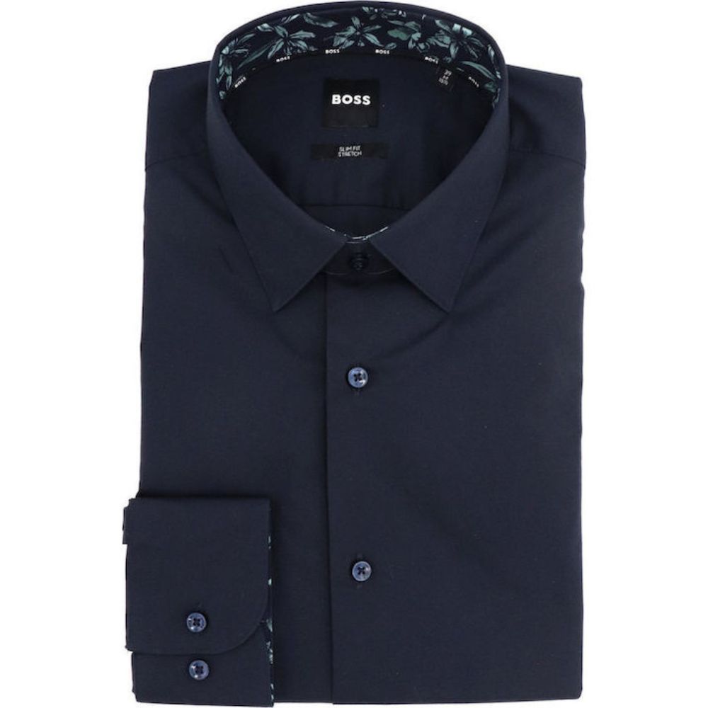 The BOSS Hank Slim Fit Navy Shirt features a modern silhouette with subtle floral trim detailing for a refined touch. Effortlessly sharp and perfect for smart-casual styling.