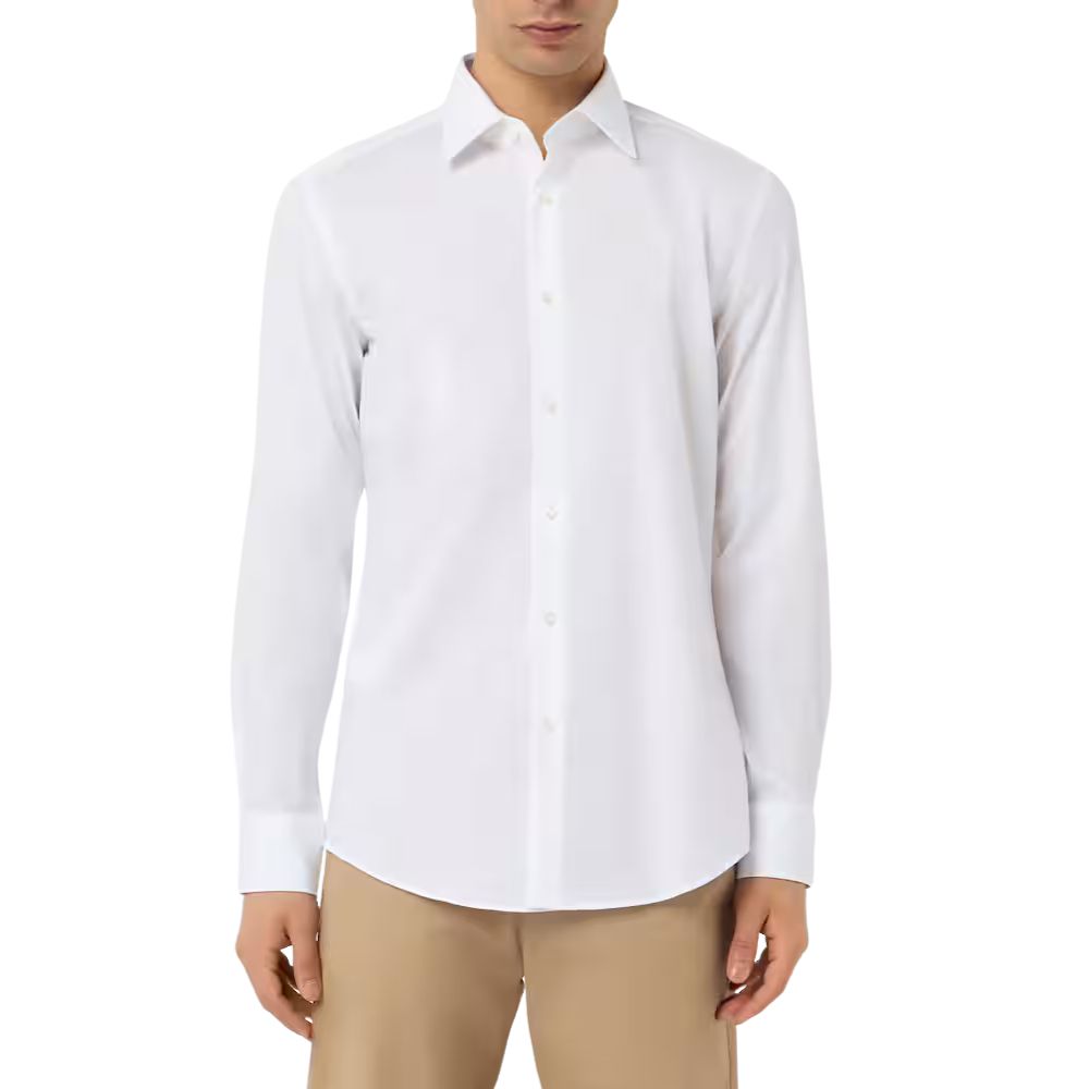 The BOSS Hank Slim Fit White Shirt features a tailored silhouette with subtle blue trim, blending classic style with a modern, stylish twist.