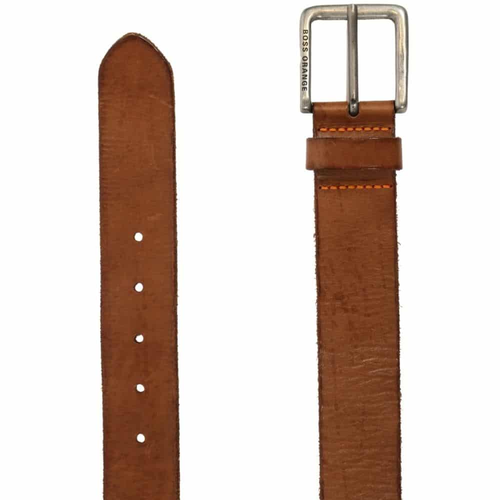 The Jeek tan leather belt by BOSS menswear offers a rustic five hole belt with engraved Hugo Boss logo on the vintage effect metal buckle. A leather fastener with orange stitch detailing completes this casual belt accessory.