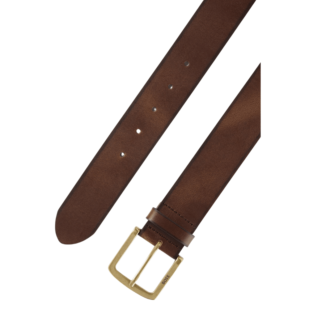 A contemporary Dark Brown belt by BOSS. Securing with a pin buckle in antique brass hardware, this 3.5cm belt is crafted in smooth leather for versatile styling. This accessory is finished with a leather keeper and an engraved logo. For the best fit, we advise ordering a belt one size larger than your waist size.