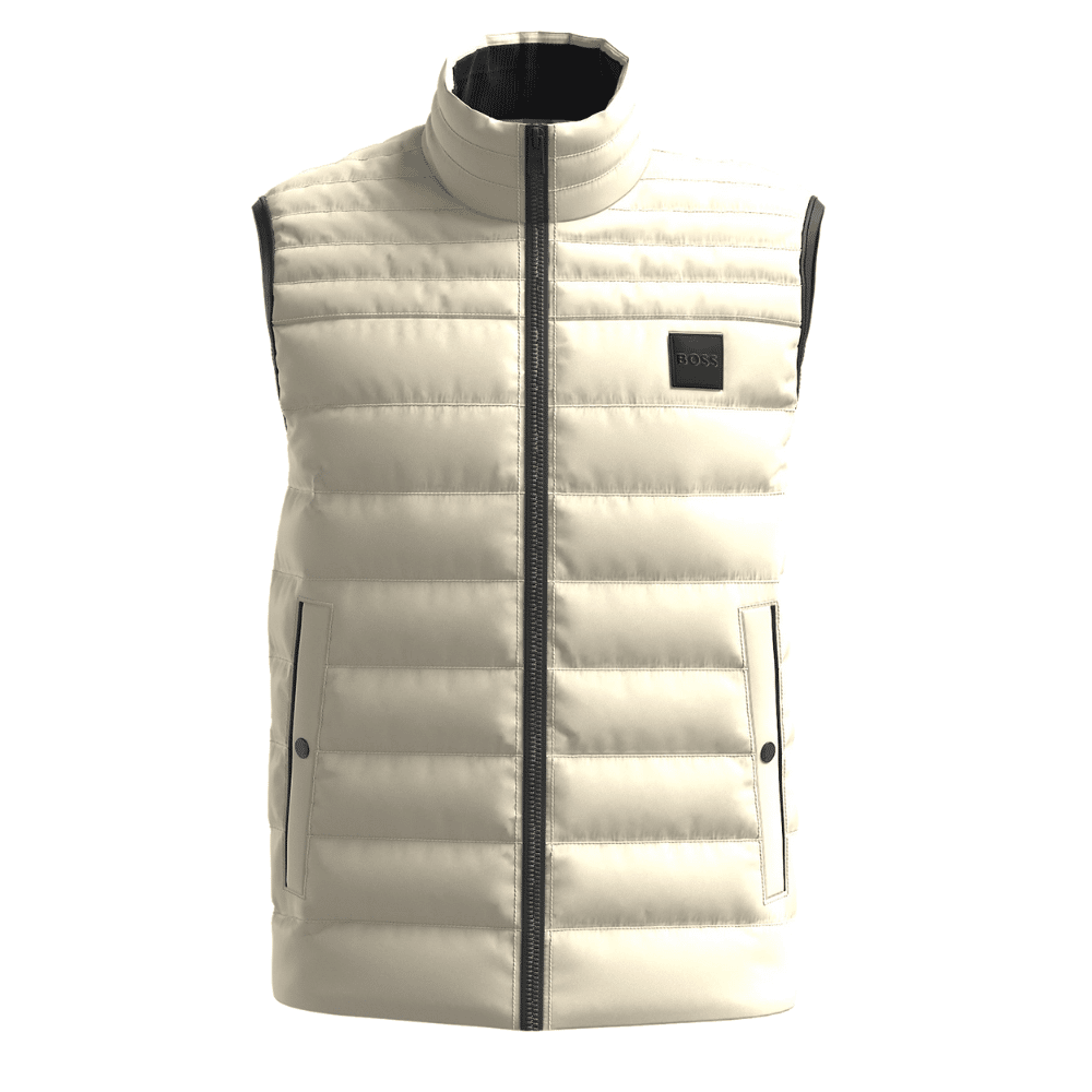 This mixed material light beige gilet is part of the BOSS Menswear Responsible collection and features two vertical press-closure front pockets and a full-length front zip closure. A contrasting orange logo patch on the left chest finishes the look in casual BOSS fashion.