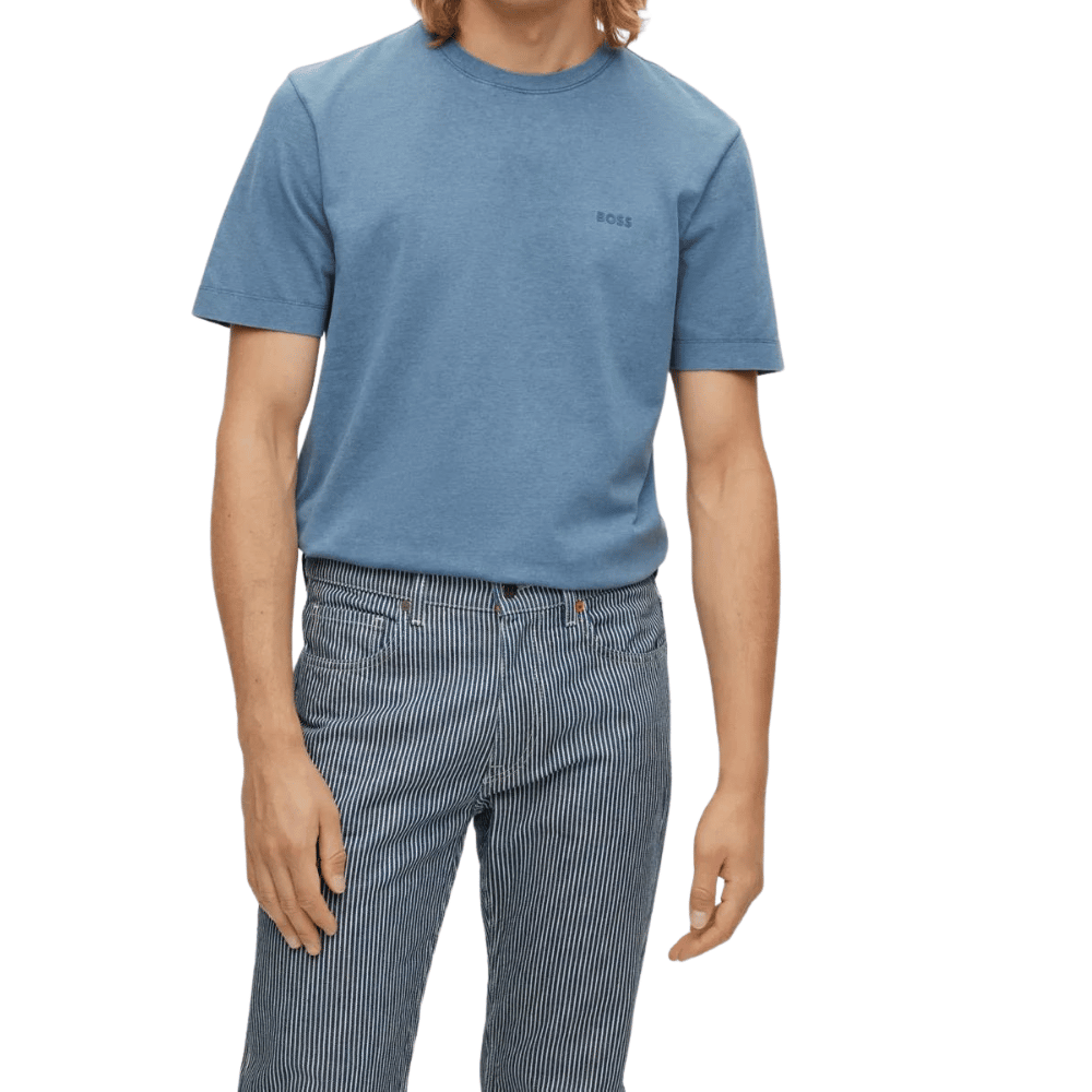 An easy-wear T-shirt by BOSS Menswear. Featuring a tone-on-tone logo print at the left chest, this short-sleeved T-shirt is cut to a straight fit and blended with stretch for comfort in movement.
