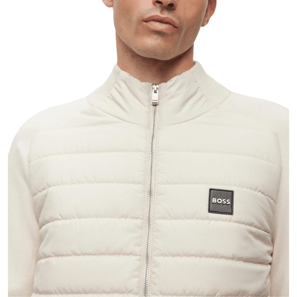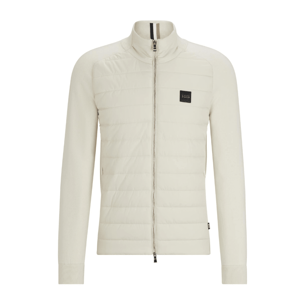 An Off white full zip hybrid jacket by BOSS Menswear, cut to a regular fit in mixed materials with padding and a logo badge at the chest.