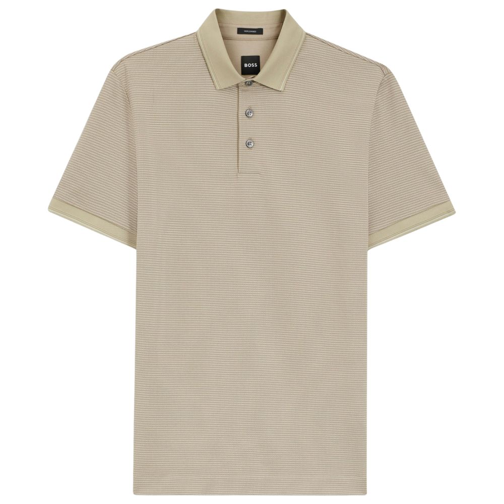 The BOSS Mercerised Cotton Beige Polo Shirt With Three Tone Jacquard combines refined texture with a modern, polished look. Made from mercerised cotton for a smooth finish and subtle sheen, it features a three-tone jacquard detail that adds a sophisticated touch to a classic polo style.