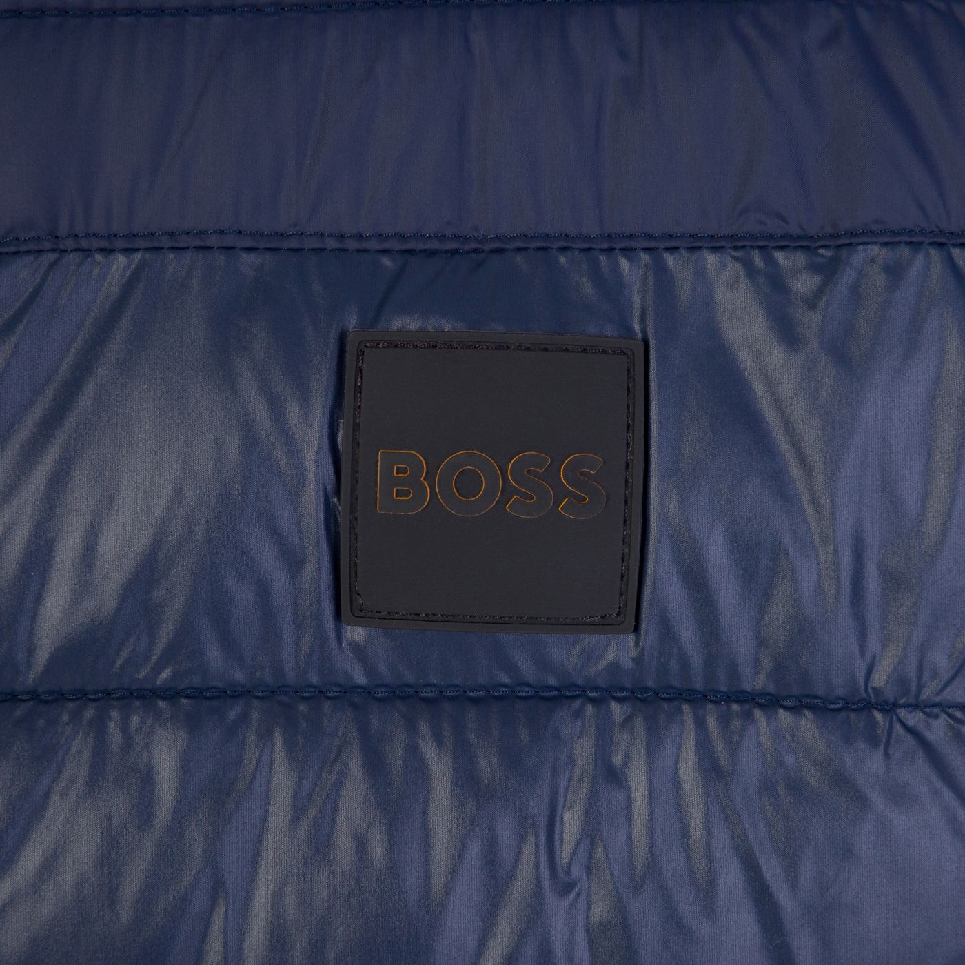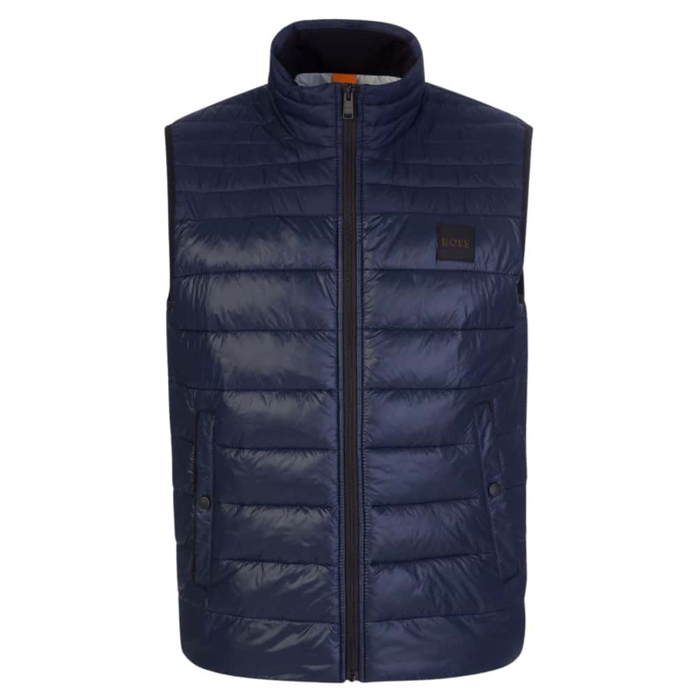 This mixed material Navy gilet is part of the BOSS Menswear Responsible collection and features two vertical press-closure front pockets and a full-length front zip closure. A contrasting orange logo patch on the left chest finishes the look in casual BOSS fashion.