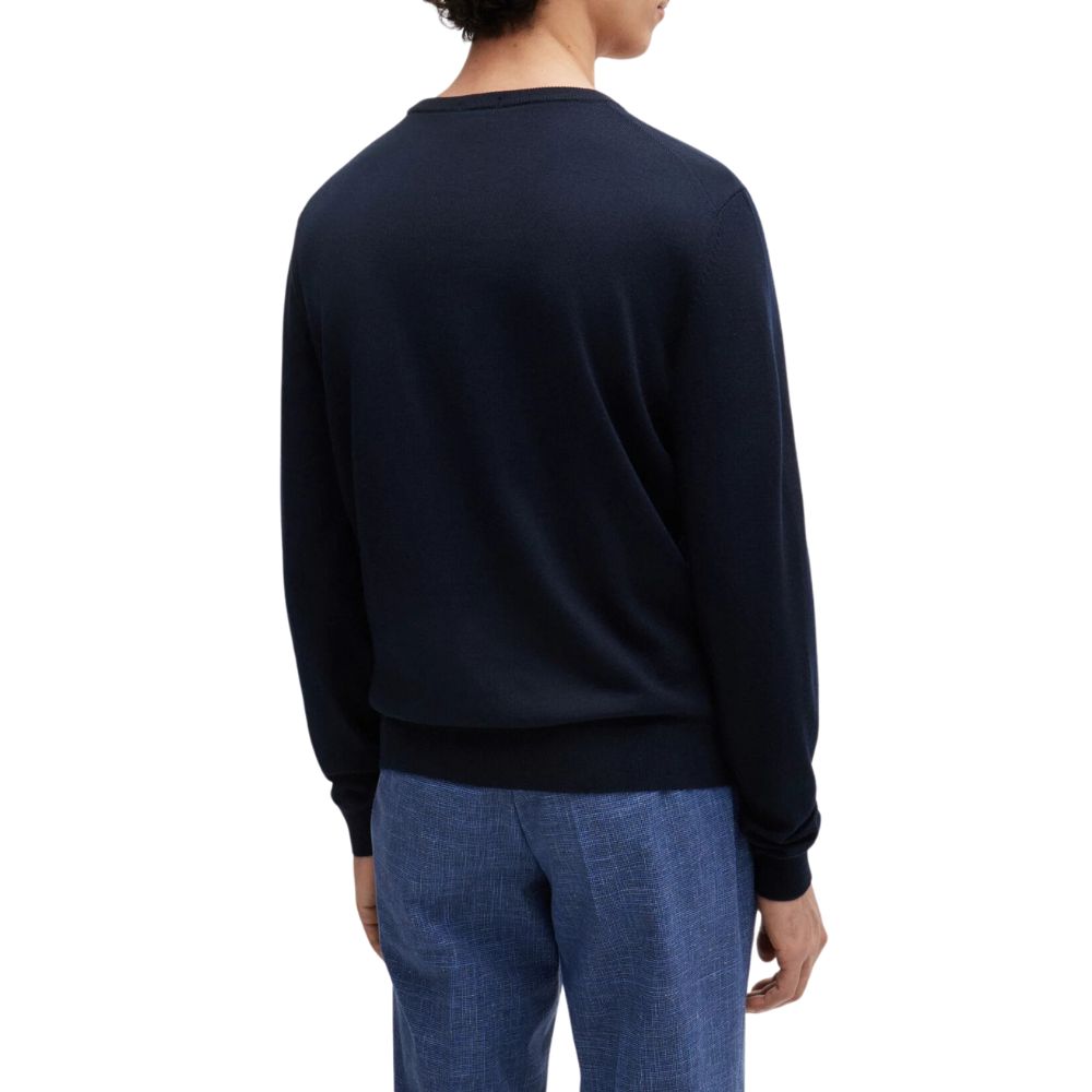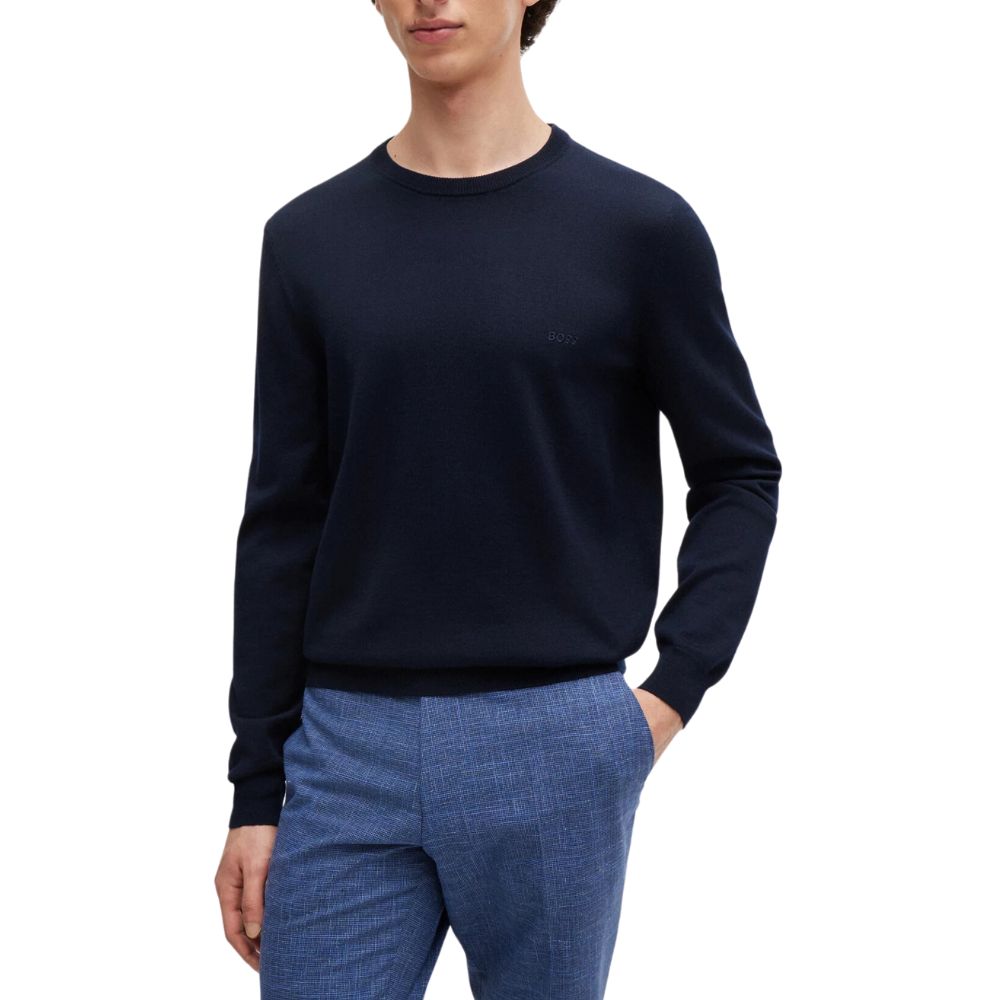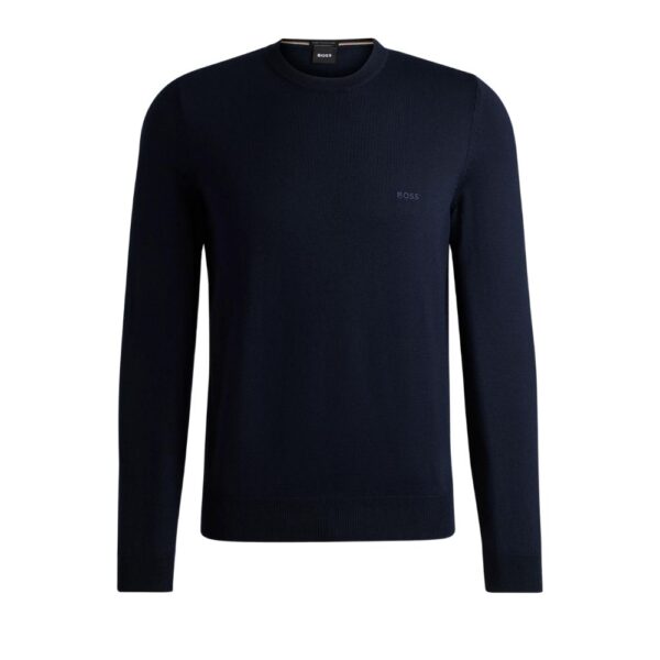 A versatile Navy jumper by BOSS Menswear. Featuring an embroidered logo at the left chest for signature appeal, this elegant jumper is cut to a regular fit for easy layering and detailed with a signature stripe inside the crew neckline.