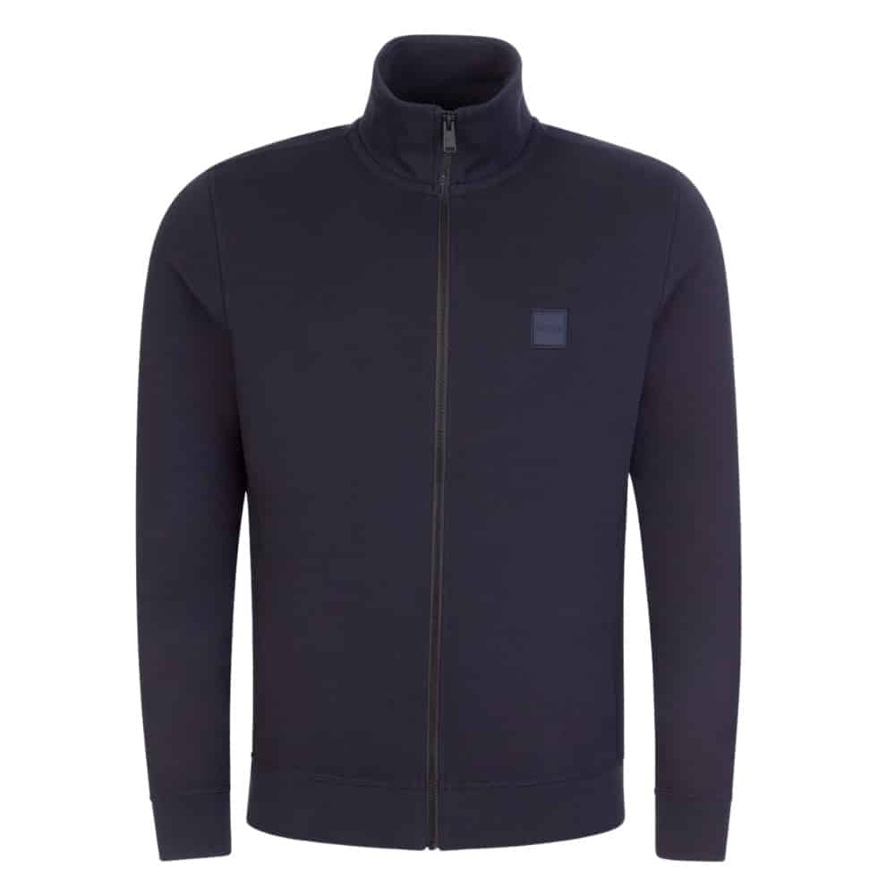 BOSS Zestart Full Zip Sweatshirt In Navy. A full front branded zip fastening in black with a ribbed stand up collar. Ribbed cuffs on the long sleeves with a stretch ribbed waistband and two pockets at the hips. The signature BOSS logo patch is embroidered on the left of the chest in black and grey.