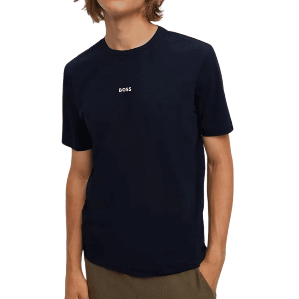 A casual T-shirt cut to a relaxed fit, by BOSS Menswear. Printed with a seven-layer logo at the centre chest, this short-sleeved T-shirt is crafted in soft cotton blended with stretch.
