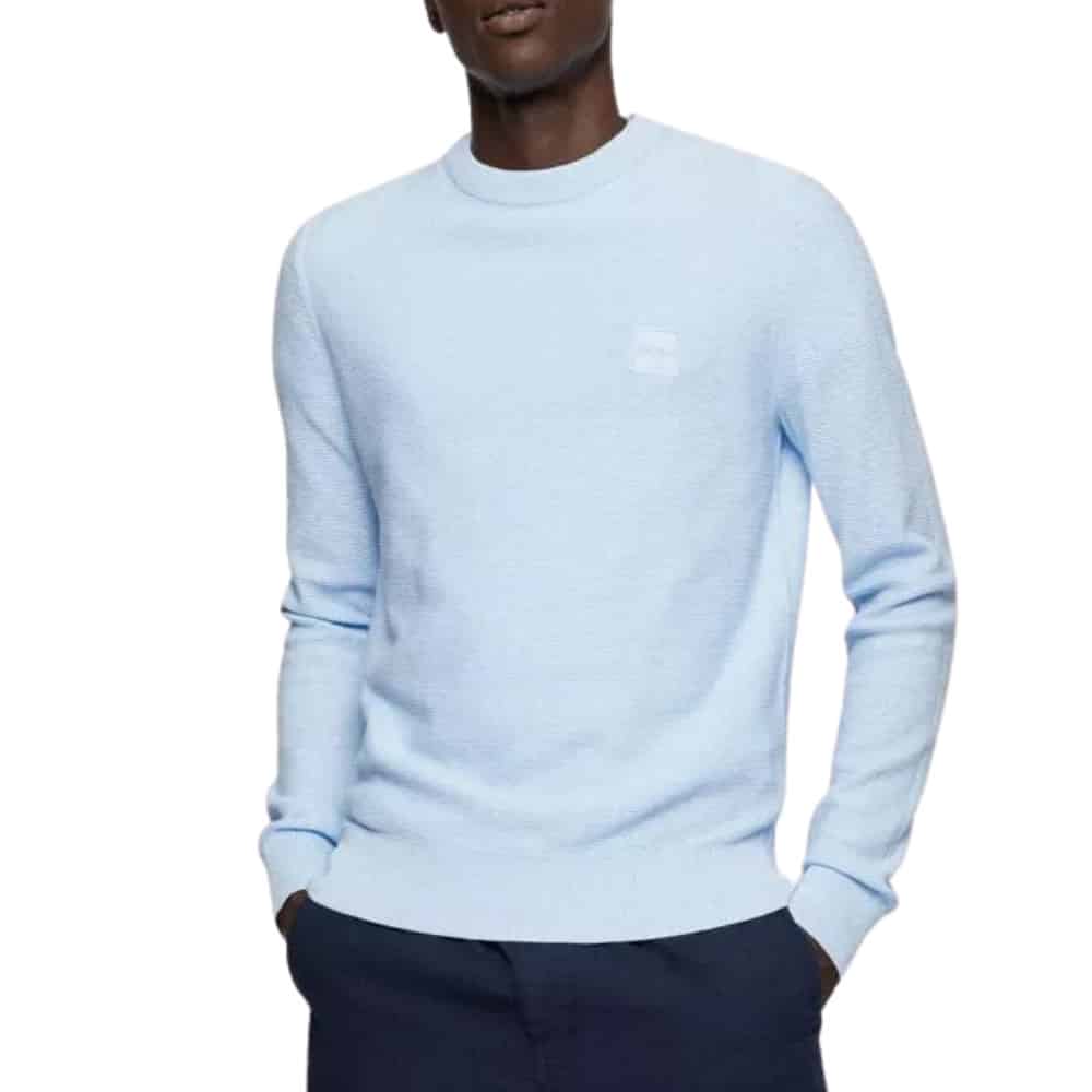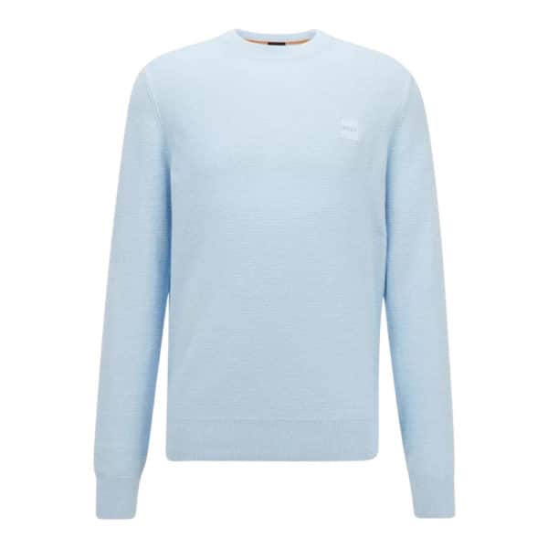 A masculine sweater with a rich structure by BOSS Menswear. Trimmed with a logo patch at the left chest, this regular-fit sweater is crafted in soft cotton blended with a touch of cashmere for luxurious softness. The inner collar is detailed with orange piping for signature appeal.
