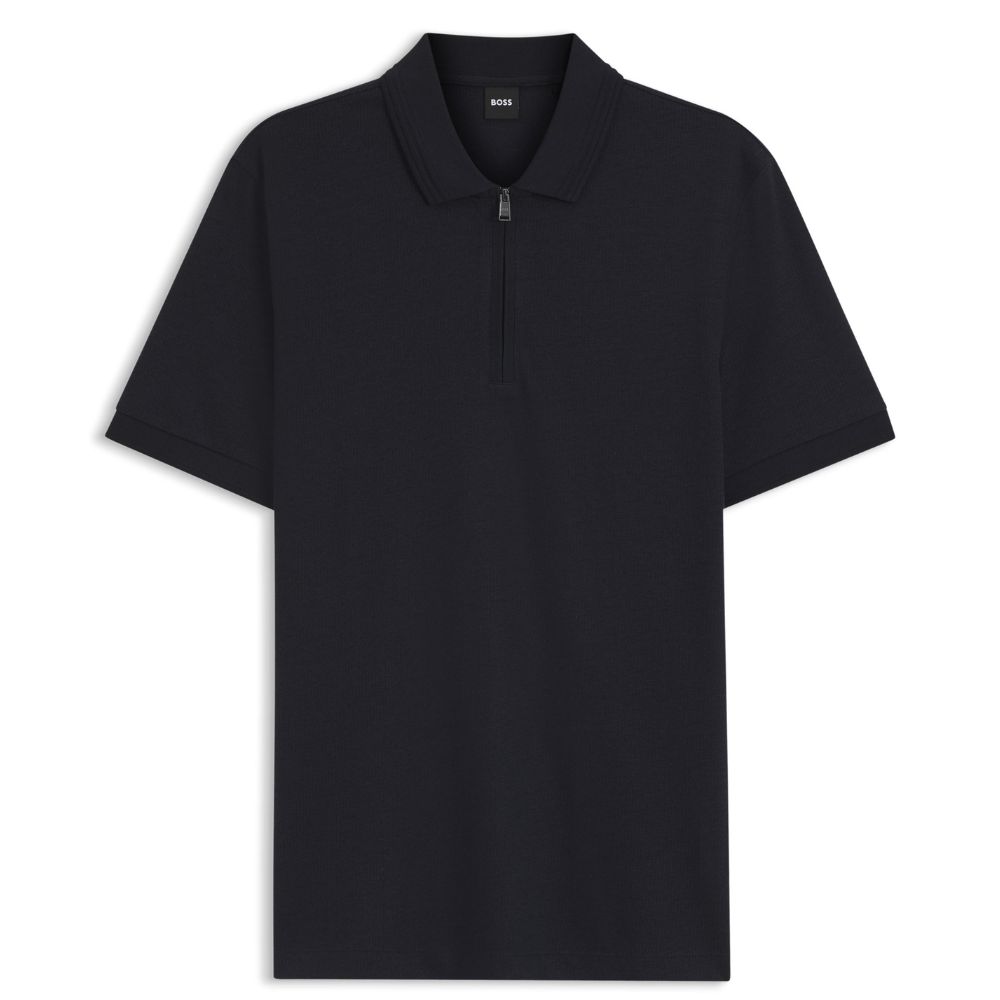 Regular Fit Polo Shirt by BOSS Menswear, crafted from a mercerised cotton blend. Featuring a zip closure with a textured collar edge and flat knit cuffs.