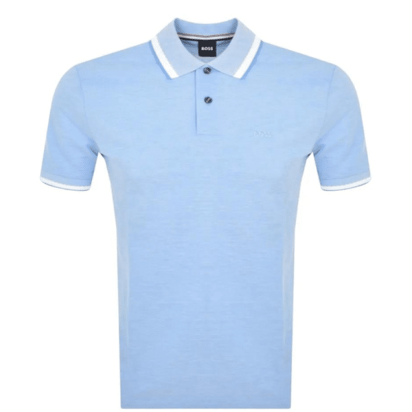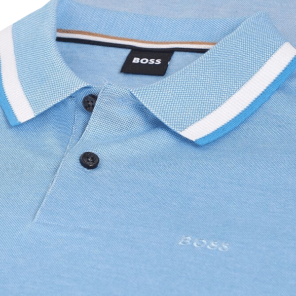 This blue polo shirt by BOSS Menswear, cut to a regular fit with a three-button placket. Crafted in stretch-cotton piqué for flexible movement and washed for softness, twin tipped trims provide sporty detail, and complete with logo patch at the left chest.
