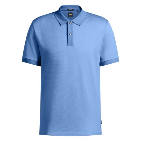 An elevated polo shirt by BOSS Menswear. Featuring a three-tone pattern offset by solid trims, this short-sleeved polo shirt is crafted in cotton with a mercerised finish for a richer, softer touch. The regular fit delivers an easy silhouette.