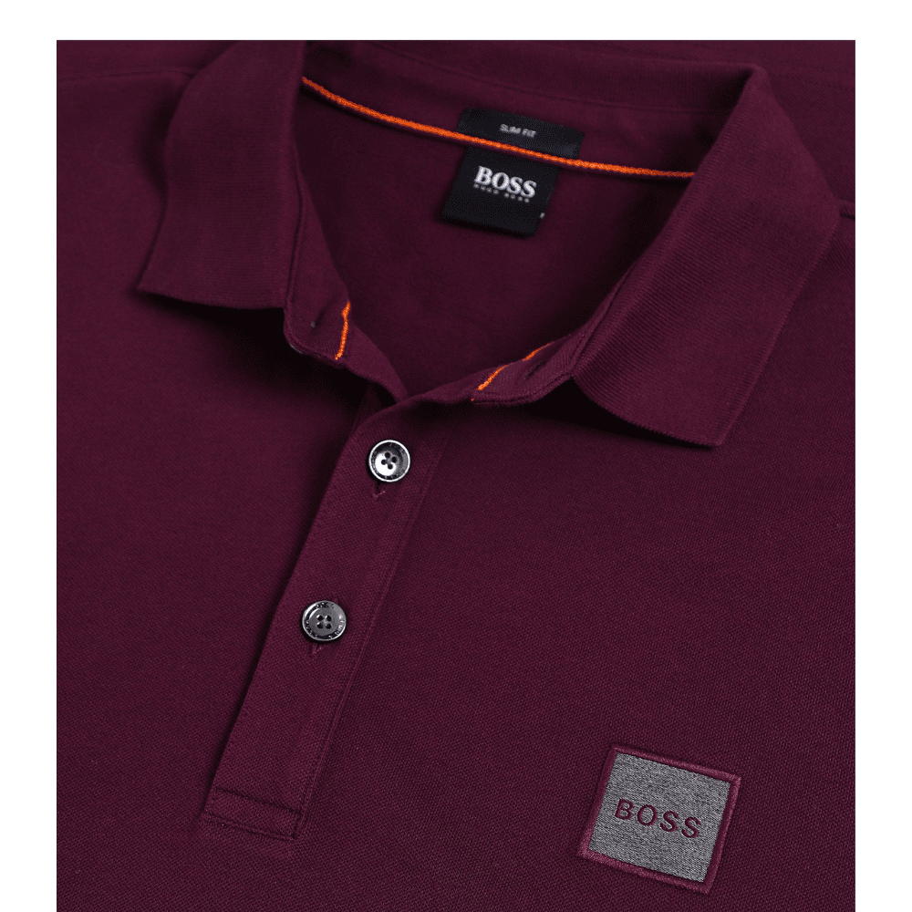 This purple polo shirt by BOSS Menswear, cut to a narrow fit with a three-button placket. Crafted in stretch-cotton piqué for flexible movement and washed for softness, this polo shirt is trimmed with a logo patch at the left chest. Wear it under a laid-back suit or a leather jacket, or pair it with jeans for smart-casual style year round.