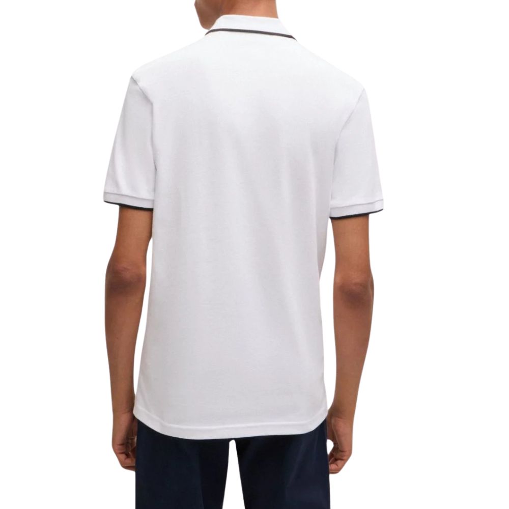 An effortless white polo shirt by BOSS Menswear, featuring a logo patch and contrast tipping. Slim fit. Crafted in washed stretch-cotton piqué for softness.