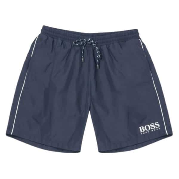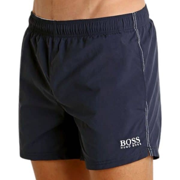 These swim shorts by Boss Menswear have the BOSS logo embroidered on left leg; small square stud with Hugo Boss logo at right hip; logo tag on back pocket; logo printed on mesh lining; logo on drawstrings. Vertical slit pocket at each side; one back right patch pocket with Velcro closure and drain hole