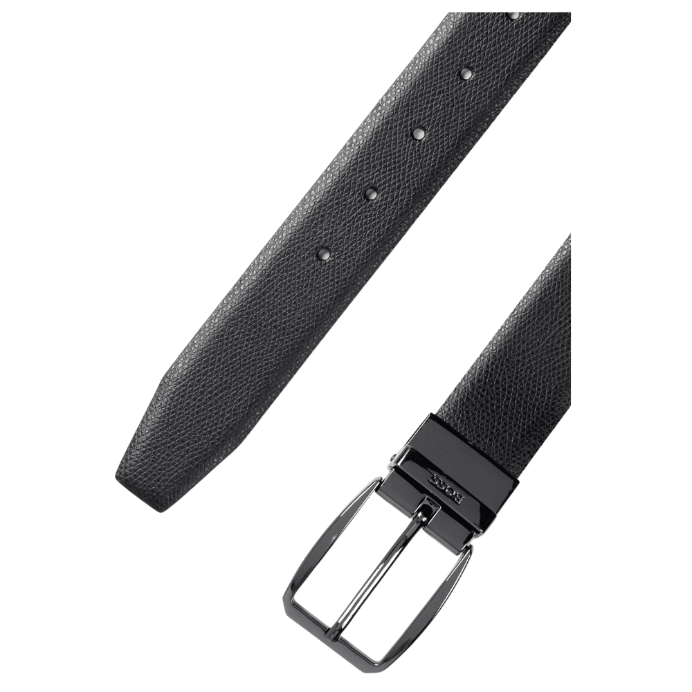 An Italian-made 3.5cm belt with a polished gunmetal pin buckle by BOSS featuring reversible colour options in smooth and structured finishes.