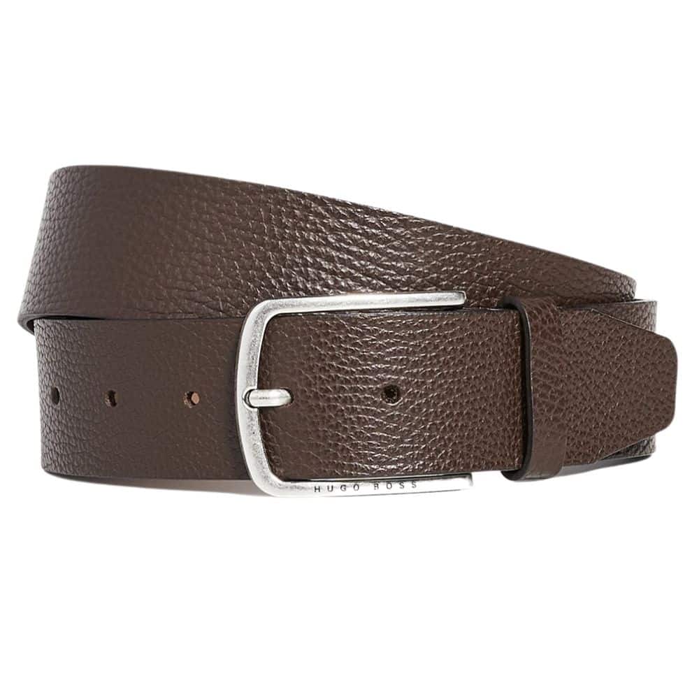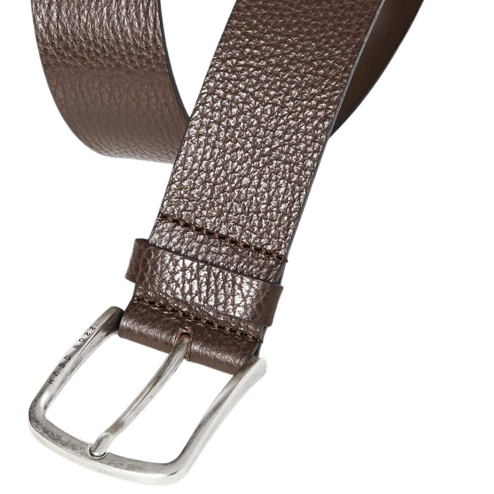 The Sander Grain Leather belt brown by BOSS menswear offers a pebbled leather twist on a classic brown belt. A five hole brown leather belt with high shine silver tone buckle, engraved with Hugo Boss logo on the base with a leather keeper.