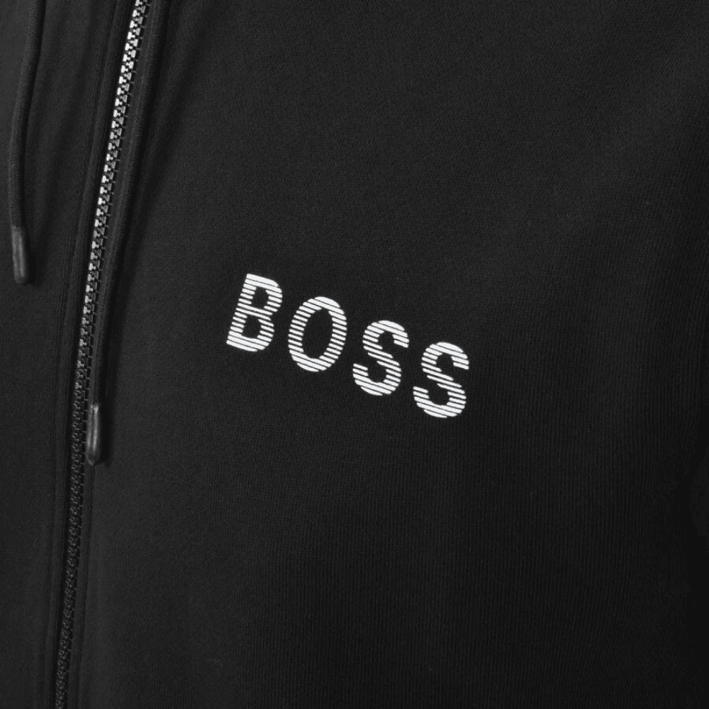 BOSS Black Sanem Full Zip Hoodie with a full front zip fastening with a large hood which features a teal interior. Woven drawstring fastenings in black with branded metal eyelets and rubberised tips. Ribbed cuffs on the long sleeves with a stretch ribbed waistband. The signature BOSS logo is situated on the left of the chest in a raised rubberised iridescent print design. Two pouch pockets are situated at the waist.