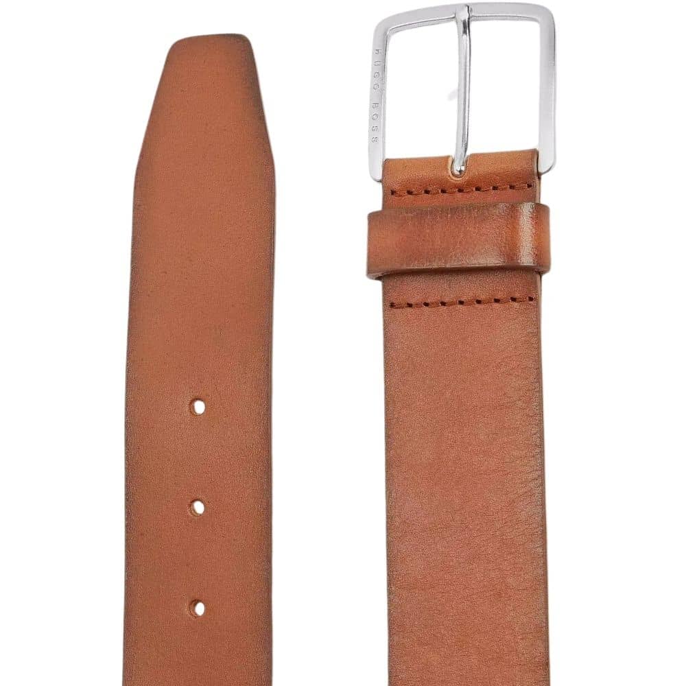 The Sjeeko leather belt in tan by BOSS menswear offers a strong and stylish five hole belt. An engraved Hugo Boss logo on the bottom of the high shine gunmetal buckle and a sturdy leather belt keeper completes this classic belt style.
