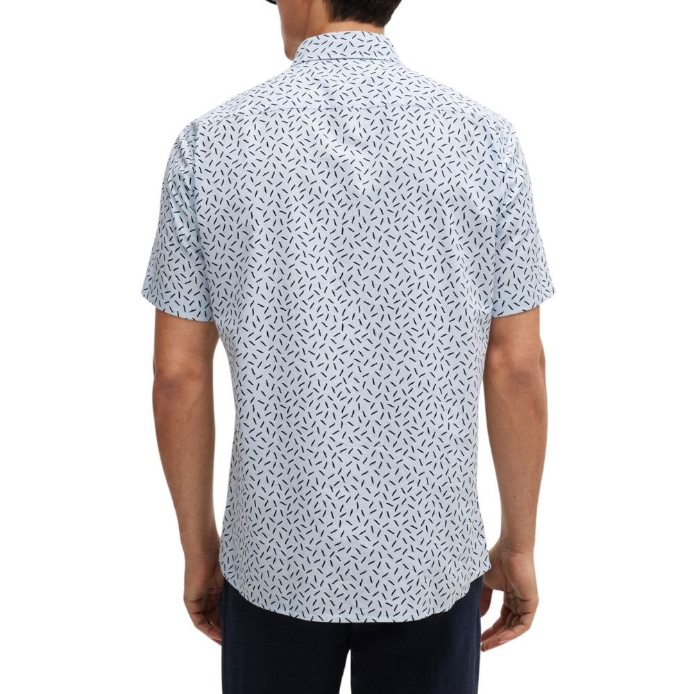 A freshly styled Light Blue shirt by BOSS Menswear. Cut to a slim fit, it is designed in breathable Oxford cotton with a seasonal print all over.