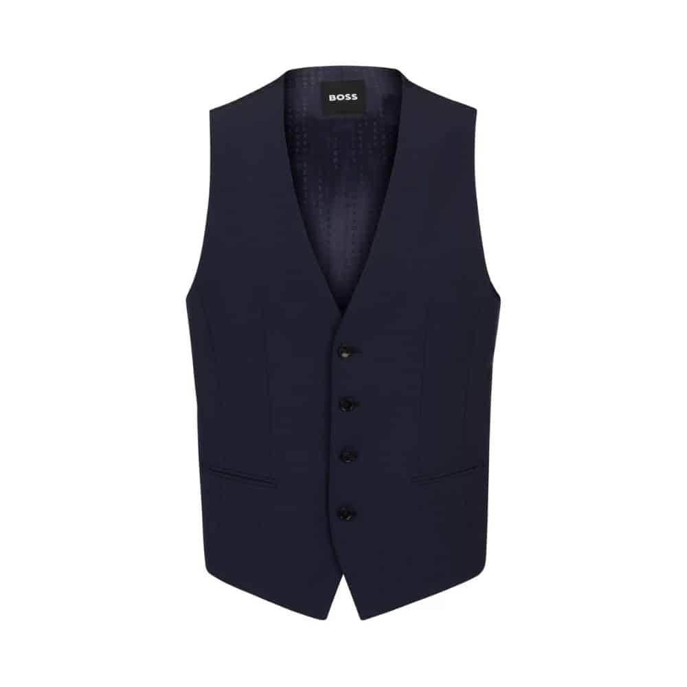 An elegant waistcoat by BOSS Menswear, designed to be mixed and matched with other pieces from the collection. Tailored to a defined fit for a modern silhouette, this four-button waistcoat is blended with stretch and lined with repeat-logo-print fabric. For our BETTER BOSS products, we always use at least 60% better raw materials. This garment is made from at least 60% responsible and certified wool. At HUGO BOSS, responsible wool means it meets the standards of the Five Freedoms of animal welfare.