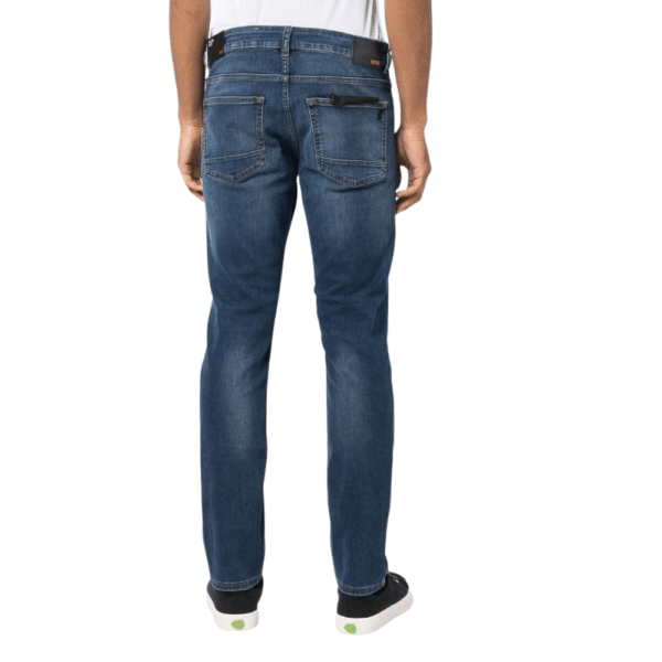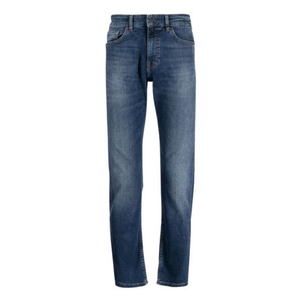 Delaware Slim Fit Jeans in a mid blue hue wash by BOSS Menswear. Featuring a button zip closure, front side pockets and back patch pockets. Made in super-stretch denim for extra comfort…