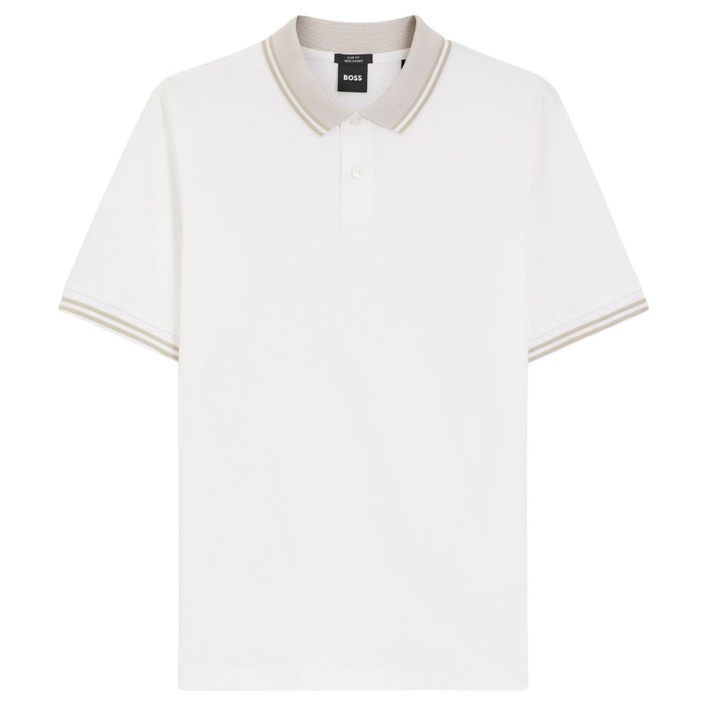 BOSS Stripe-Trim Slim Fit White Polo Shirt in Mercerised Cotton