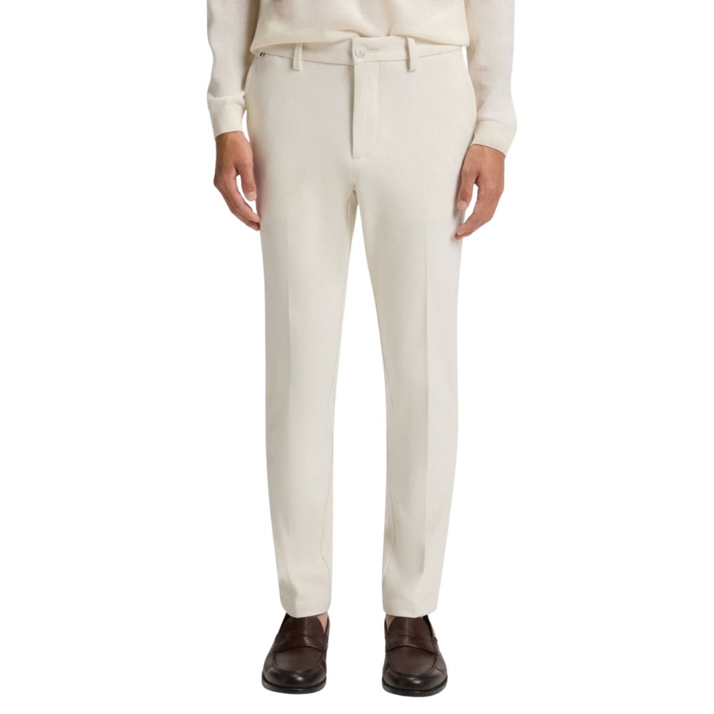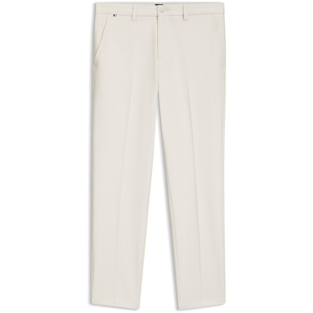BOSS Tapered Fit Stretch Cotton Cream Trousers offer a modern, streamlined silhouette with a comfortable stretch for ease of movement. Perfect for smart-casual or refined outfits, their neutral cream tone pairs effortlessly with a variety of shirts and jackets.